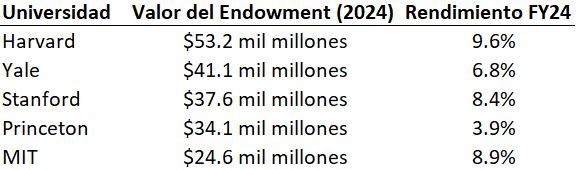 Nos centraremos en el estudio del Endowments de Harvard, por ser el más destacado en cuanto a volumen y por haber obtenido la mayor rentabilidad en 2024, en comparación con otras universidades.