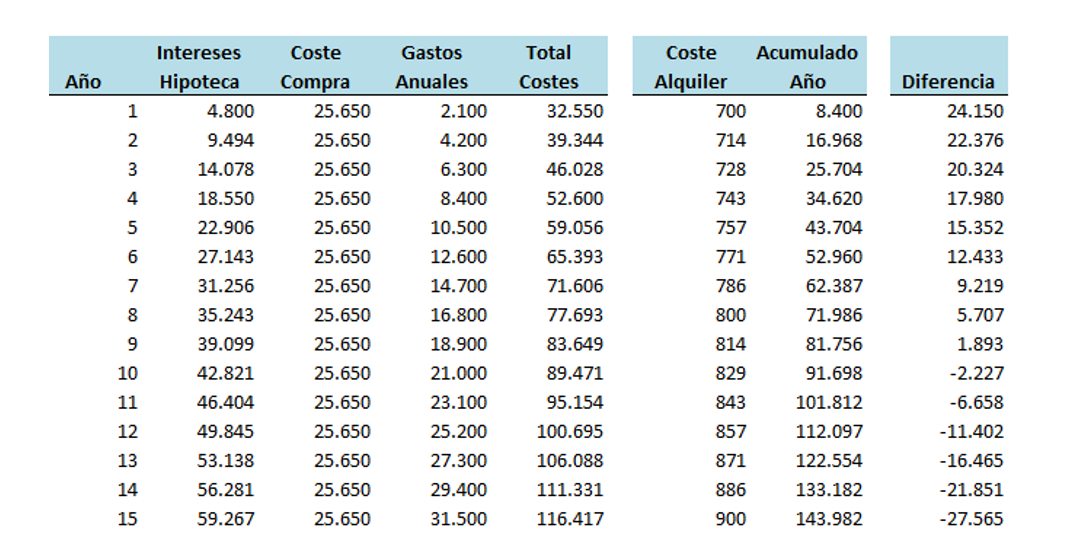 Gastos de Alquiler + Intereses Hipoteca Año. 2.100 + 4.800 = 6.900 euros.
