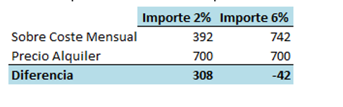 Suponiendo que el coste de arrendamiento de dicho inmueble es de 700 euros, podemos concluir que si los costes de hipoteca son del 6% sería preferible el alquiler.