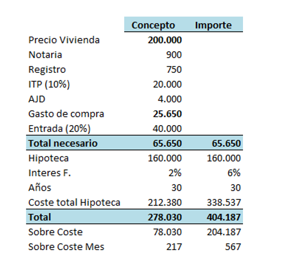 Vivienda de 200.000 euros de compra con una hipoteca de 160.000 euros. Nos exige un el desembolso inicial de 65.650 euros.