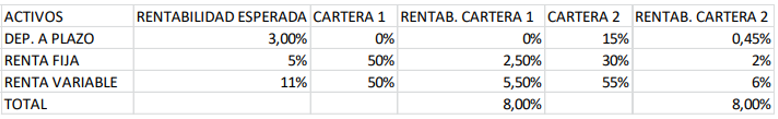 Si nuestro objetivo es obtener un 8% de rentabilidad podemos formar varias carteras que nos reportan la rentabilidad pretendida.